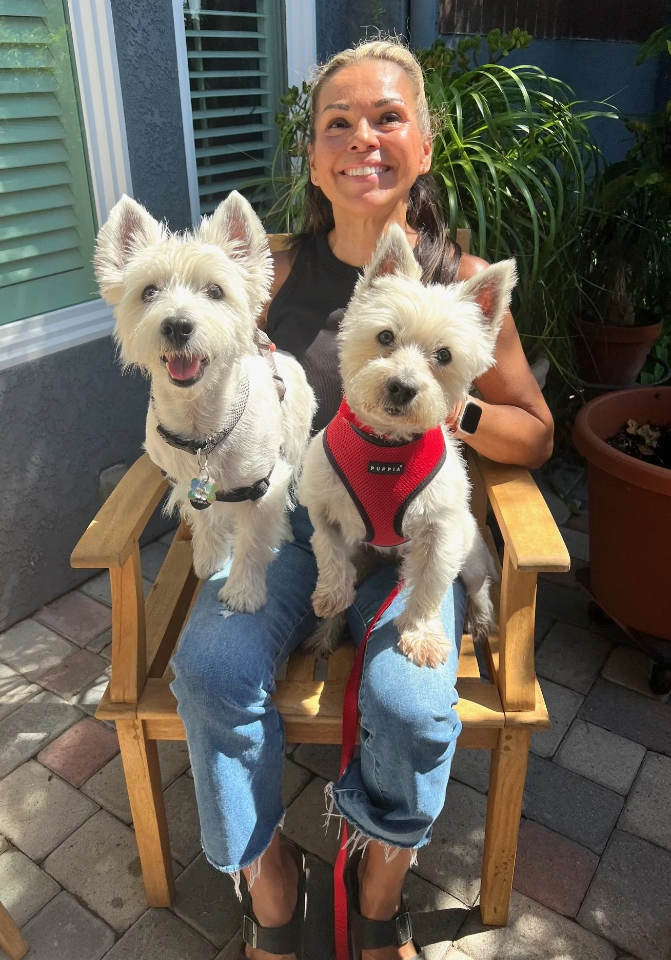 I was adopted by Lisette. Mom traveled a long way to come for me and we flew home on a plane. I loved meeting my new Dad and Westie Carter. He is my new best friend. We play together, walk together, and sleep together. It took a little while to find my perfect family, but it was worth the wait. I am a really happy girl. XOXO Mia